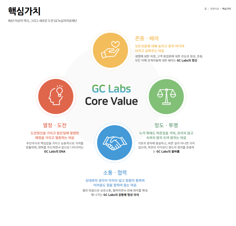 녹십자의료재단은 “인류 건강에 기여한다”는 핵심 가치를 바탕으로 성장해 왔습니다. 비전: 질병 없는 건강한 사회를 만들고, 혁신적인 기술과 서비스를 통해 헬스케어 산업을 선도합니다. 인재상: 전문성, 책임감, 긍정적인 마인드를 갖춘 인재를 중요하게 생각합니다. 사업: 진단검사, 제약, 의료기기 등 다양한 헬스케어 사업을 전개하고 있습니다.