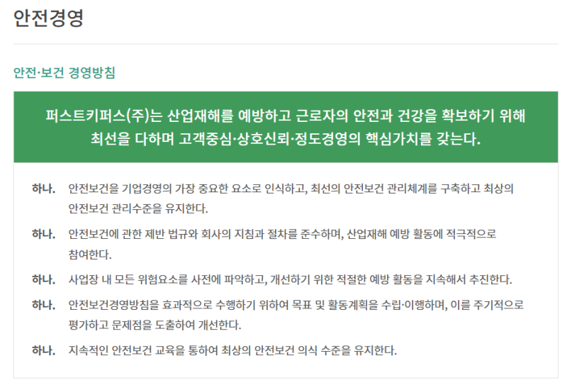 퍼스트키퍼스는 시설 관리 및 아웃소싱 전문 기업으로, 쾌적하고 안전한 환경을 조성하는 데 기여하고 있습니다. 특히 미화직은 건물의 청결 유지뿐만 아니라, 긍정적인 이미지를 전달하는 중요한 역할을 수행합니다. 채용 과정에서는 성실함, 책임감, 그리고 꼼꼼함과 같은 기본적인 자질을 중요하게 평가합니다. 또한, 지원하는 기업의 가치와 인재상에 부합하는 인재를 선호합니다.