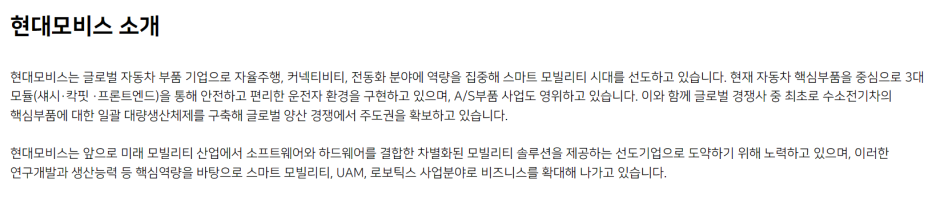• 지원자 내용 요약: 현대모비스의 미래 기술에 대한 관심과 기여하고 싶은 마음을 표현했지만, 추상적인 내용 위주였습니다.
