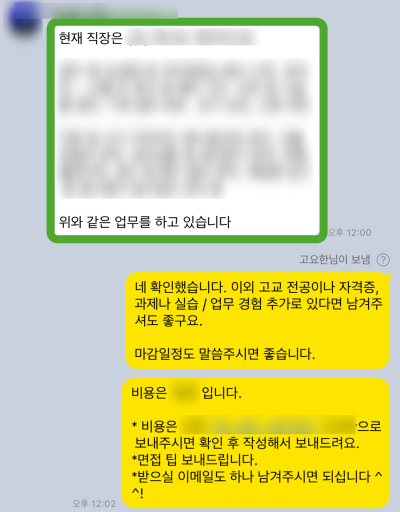 수정 과정에서는 지원자분과 끊임없이 소통하며, 자소서의 완성도를 높여나갔습니다. 이 부분에서 대부분 탈락합니다.